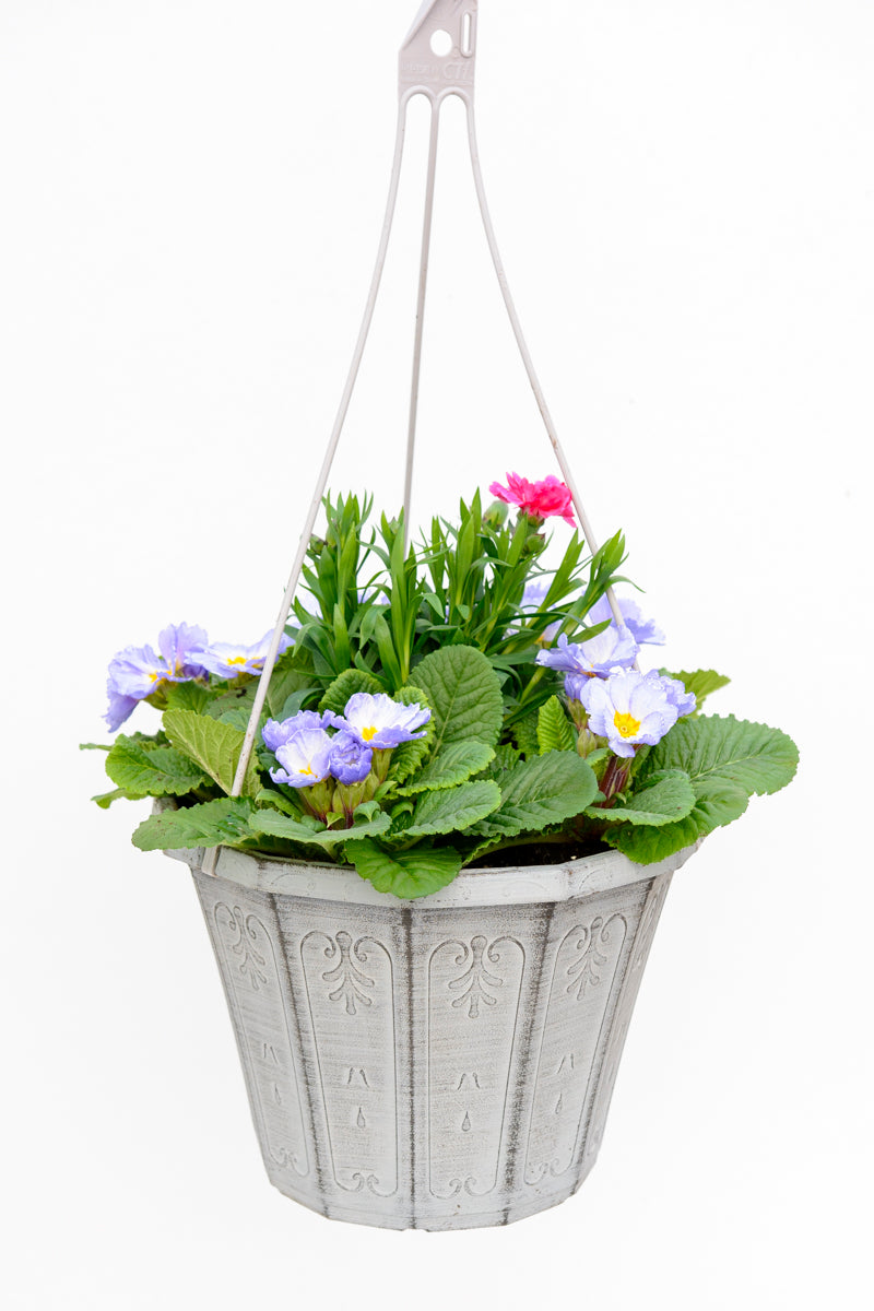 Elegant hanging pot planted with a scented Dianthus and Primroses